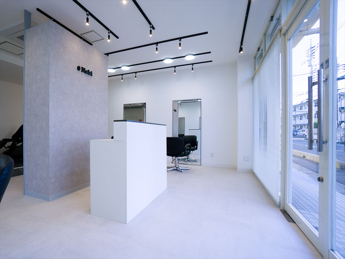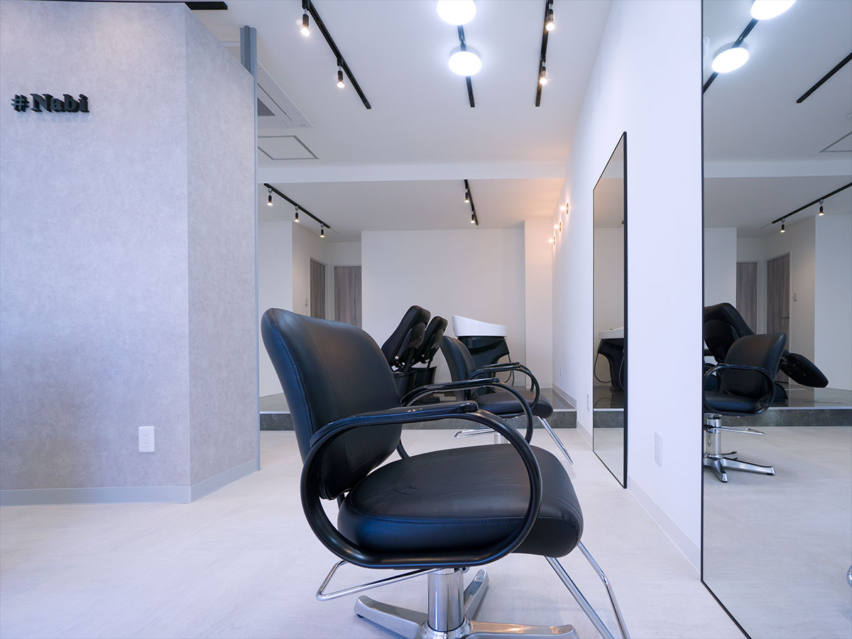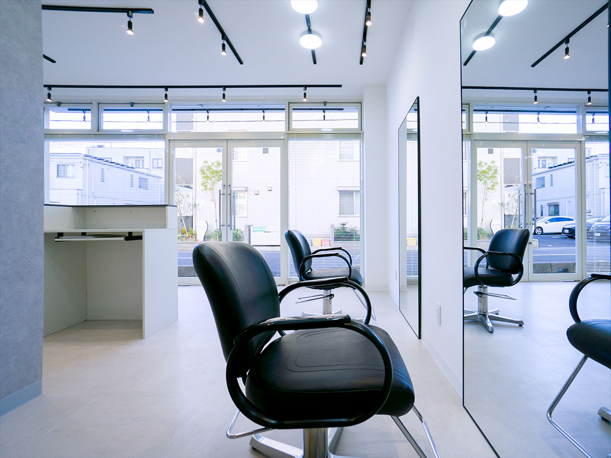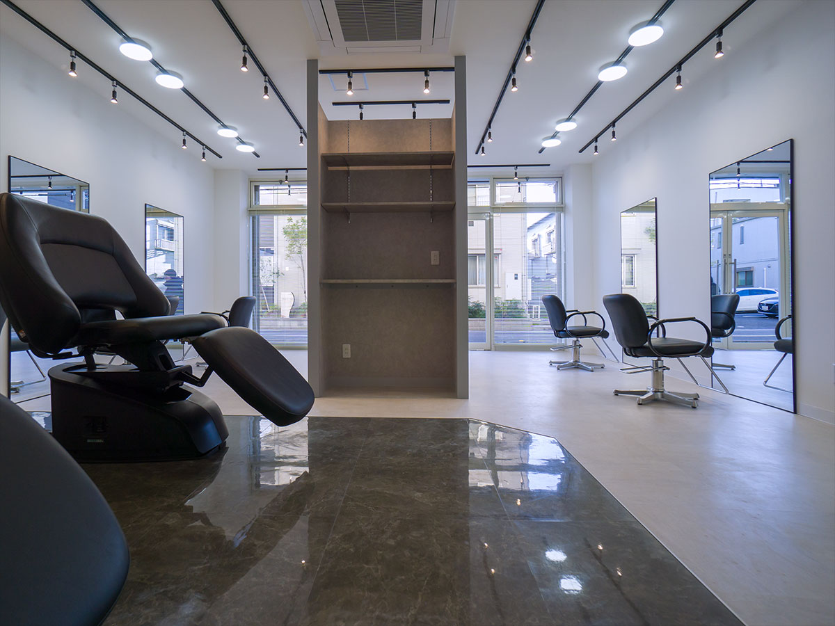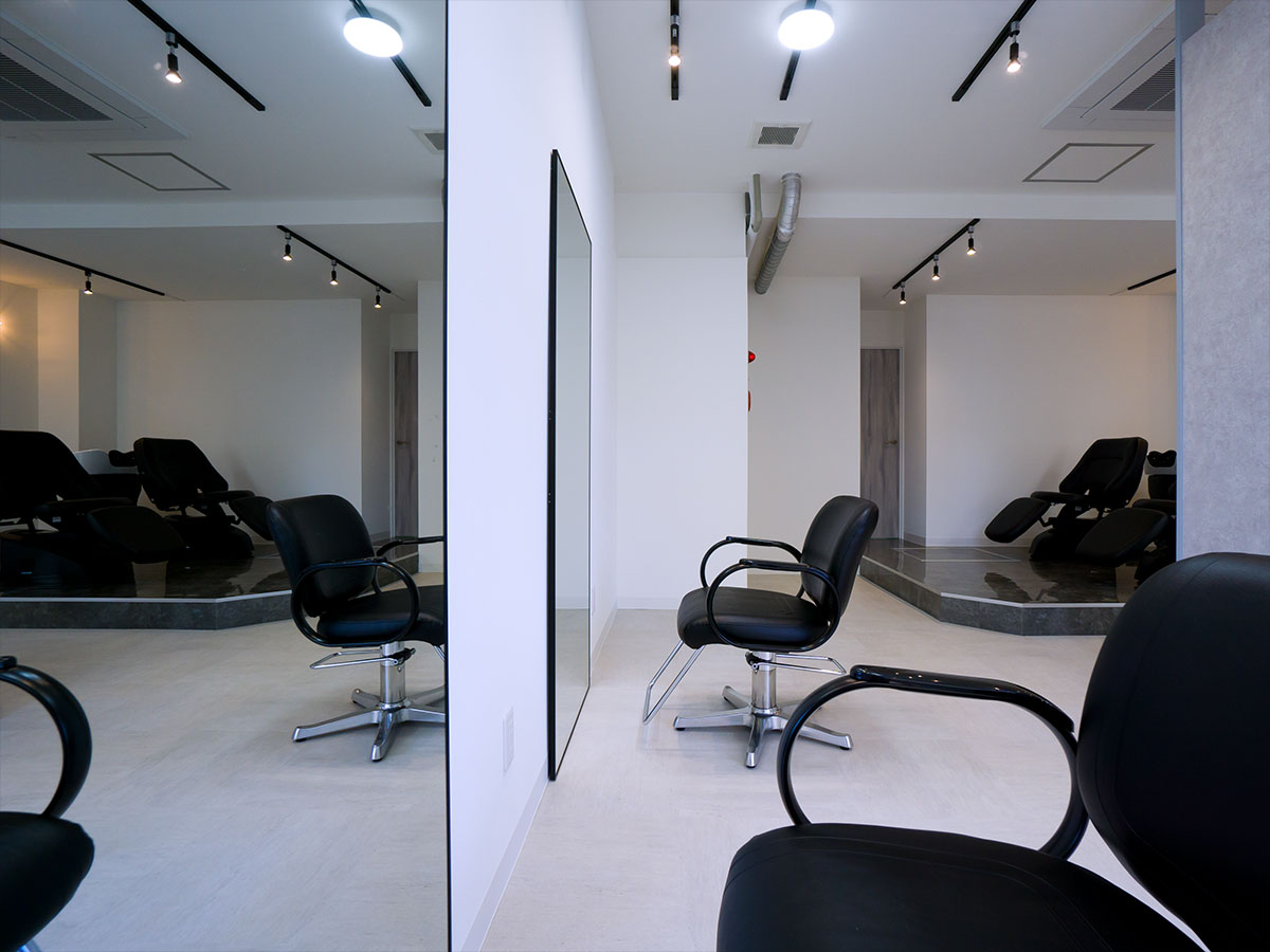 受付を中央に配し、セット面の距離感をとったゆったり空間の駅近サロン。