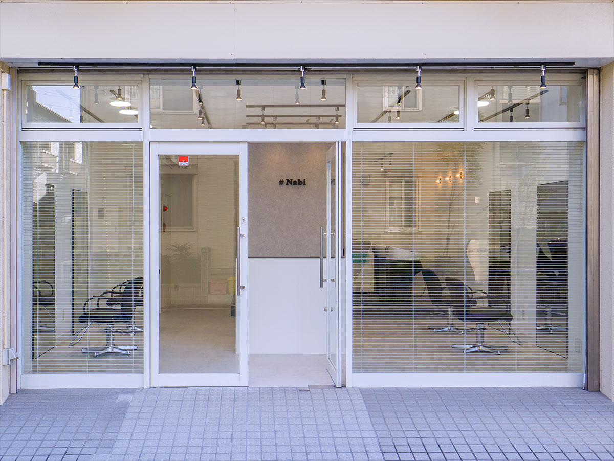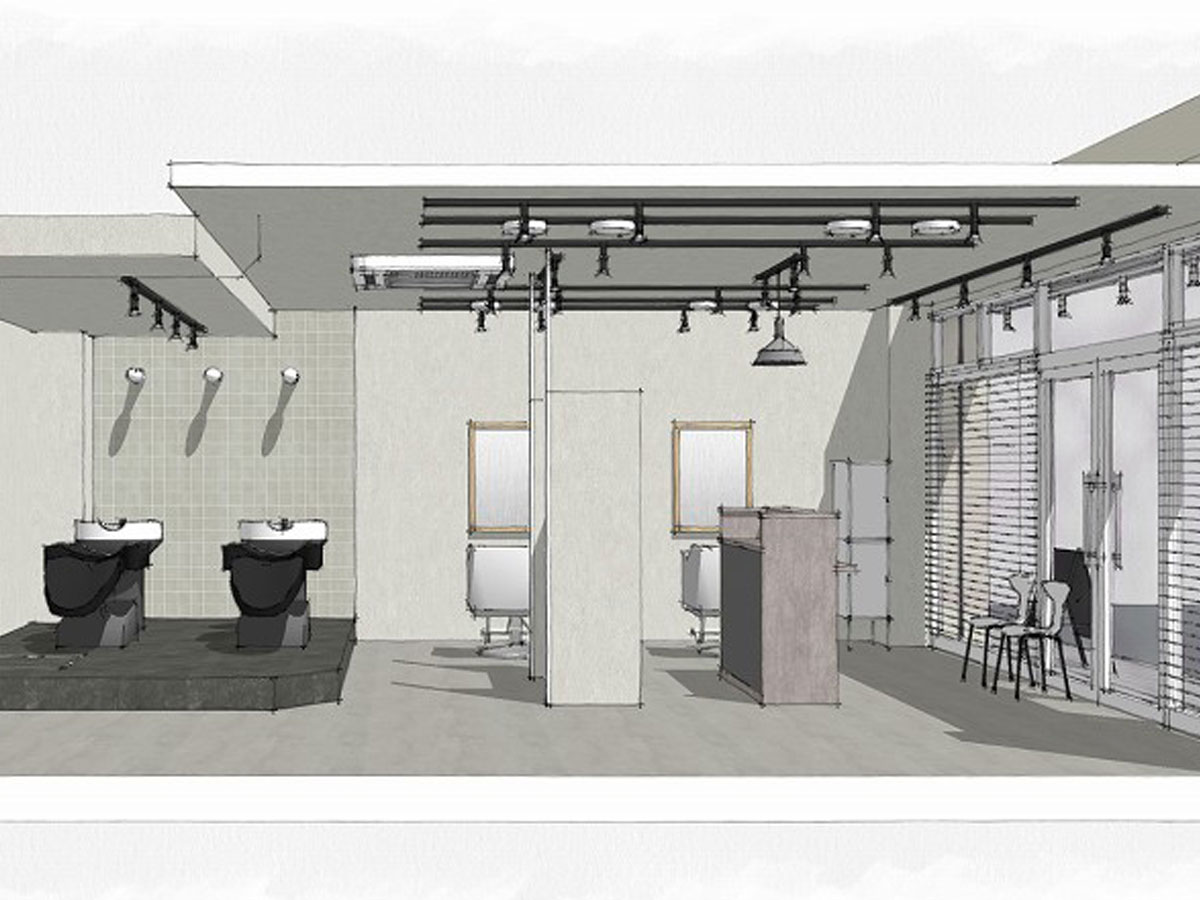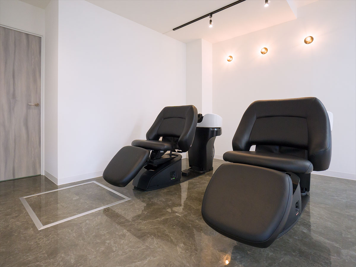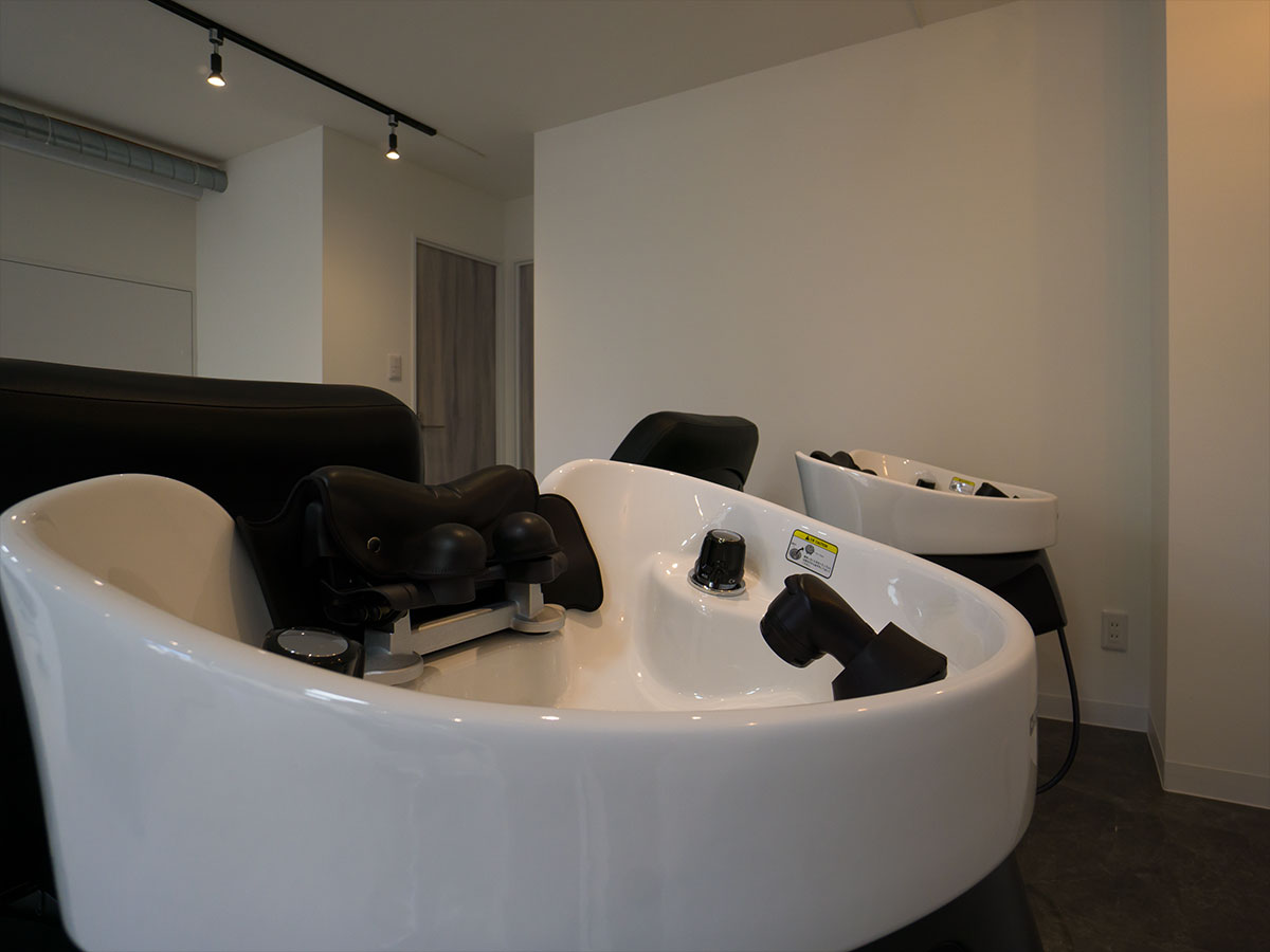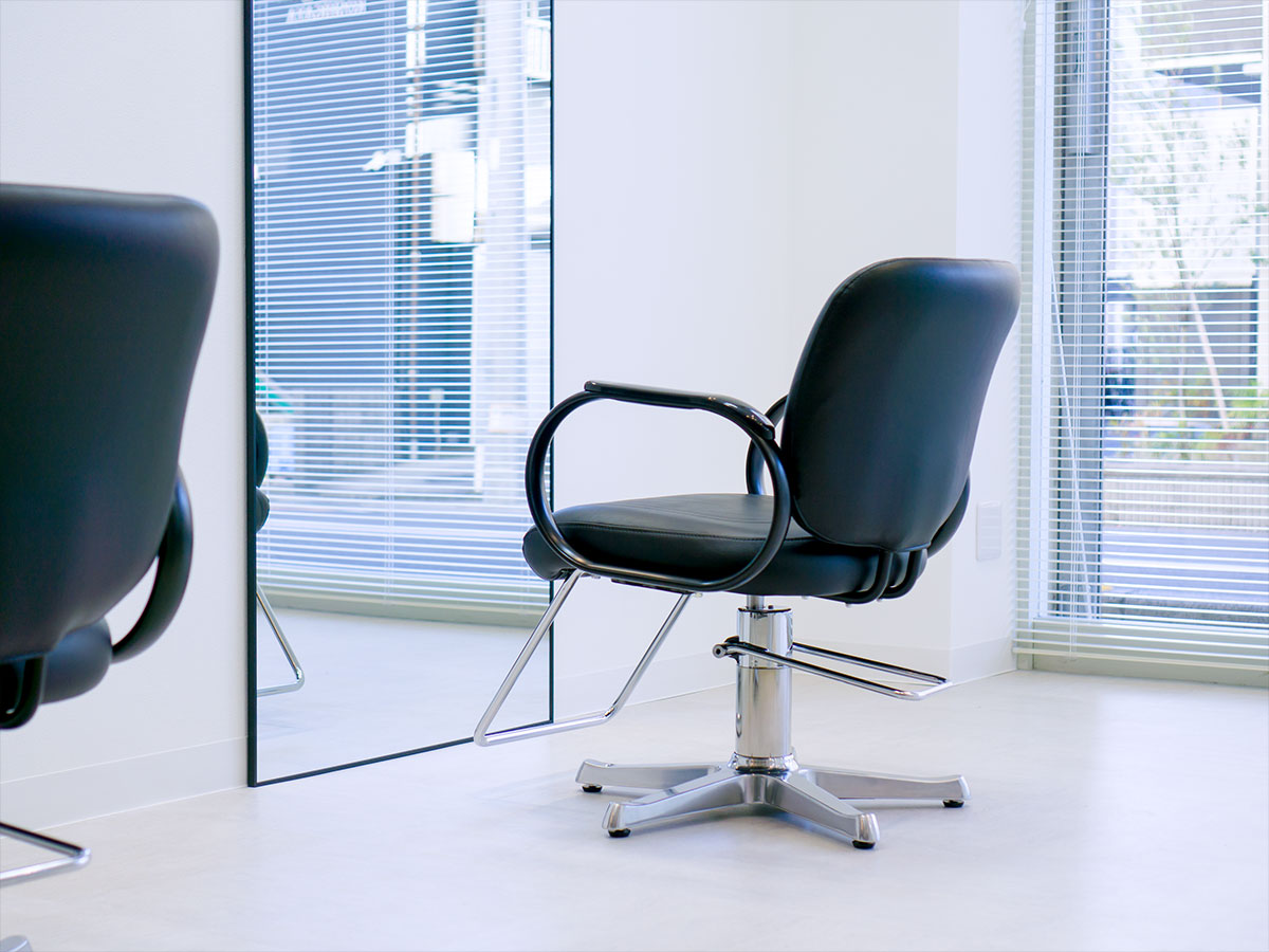受付を中央に配し、セット面の距離感をとったゆったり空間の駅近サロン。